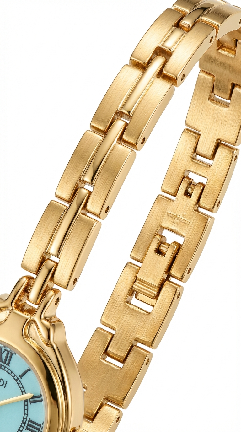 Delicate gold watch with a pale blue face and Roman numeral detailing. Slim bangle bracelet, vintage proportions, the kind of piece that looks like it was passed down. Minimal, feminine, timeless. Wear it alone or stacked with thin gold bangles.