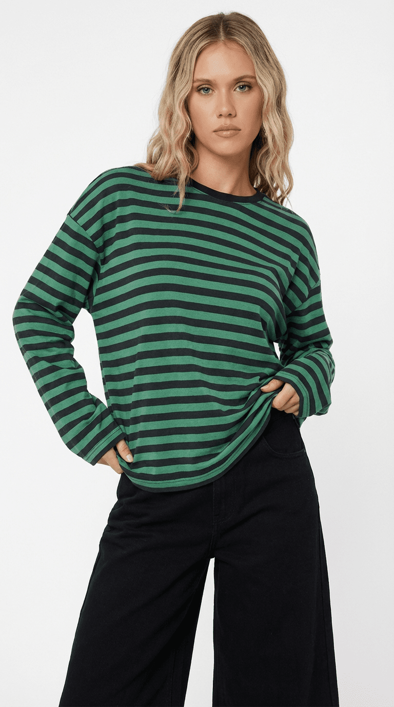 Oversized long-sleeve tee in green and black stripe. Loose through the body, dropped shoulders, the kind of shirt that hangs heavy and feels lived-in from the first wear. Pair it with wide-leg denim or baggy shorts and let it do all the talking. Effortless, slouchy, never too clean.