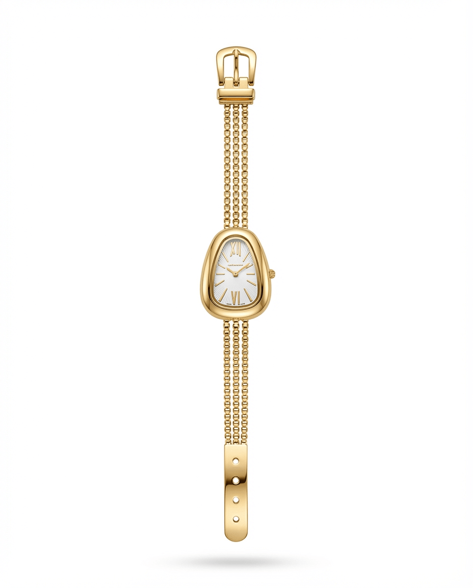 Gold-plated watch with an asymmetric case and triple-chain link bracelet. Sleek, sculptural, the kind of piece that sits on your wrist like jewelry. White face with Roman numerals, adjustable leather strap with chain detailing. Wear it solo or stacked—either way, it's making a statement.