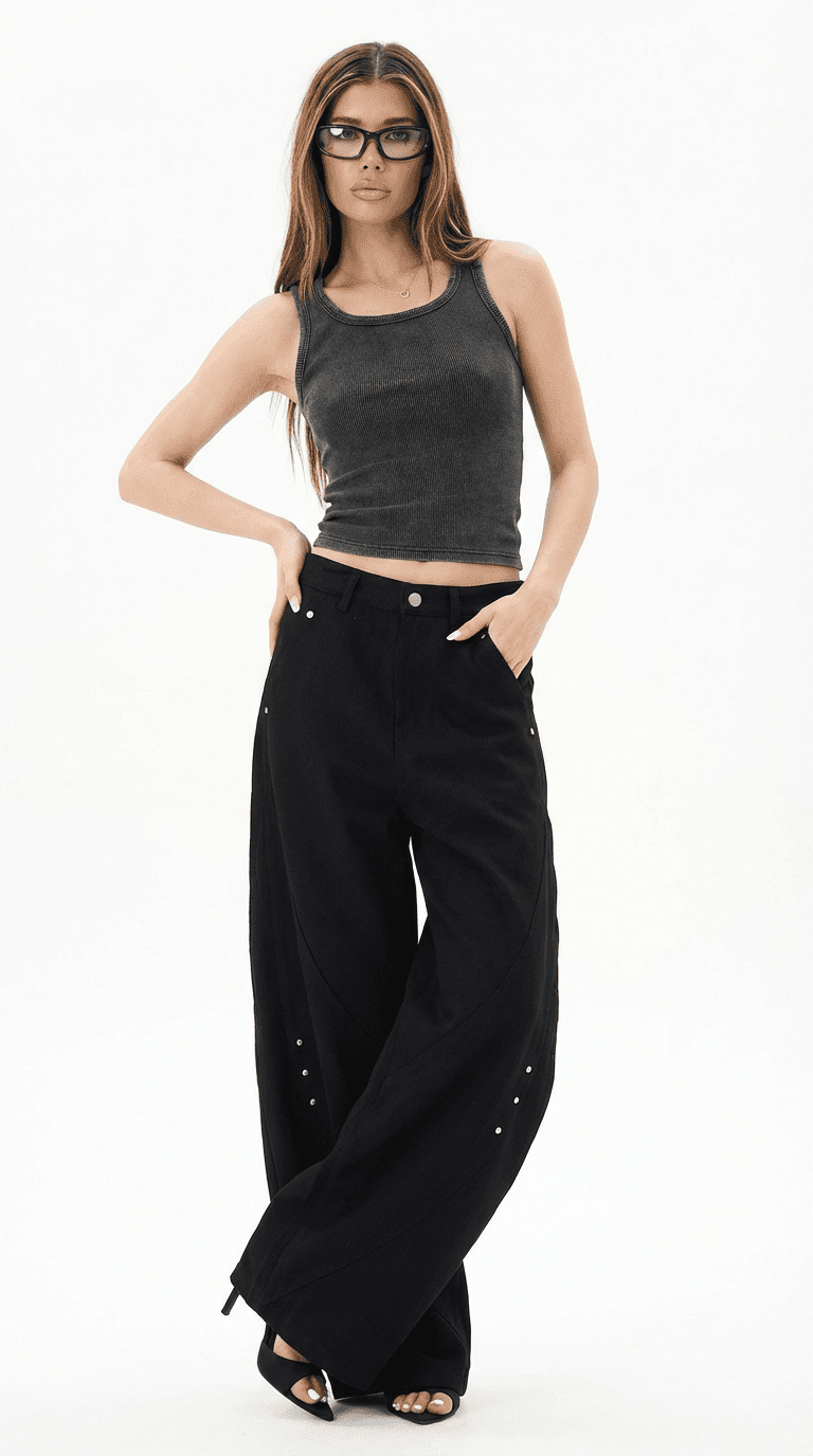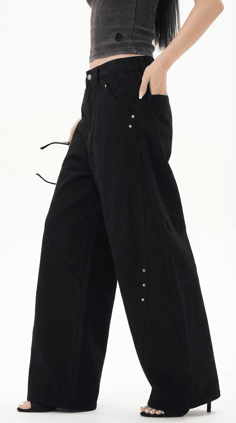 Oversized black cargo pants with silver stud detailing down the legs. Wide, low, built to move like you're walking through smoke. Heavy cotton twill with utility pockets and metal accents that catch light when you walk. The kind of pants that don't need anything else—just throw on a crop and go.